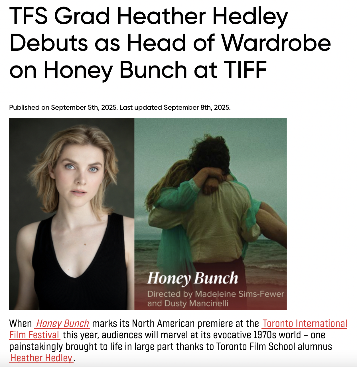 Her narrative credits include We Were (Trust Films), We Three Queens Season Two (AppleTV Canada, OutTV) and serving as Head of Wardrobe for Honey Bunch (2025), which had its world premiere at Berlinale 2025, and later at the Toronto International Film Festival (TIFF), starring Jason Isaacs, Kate Dickie, Grace Glowicki, Ben Petrie, and India Brown.